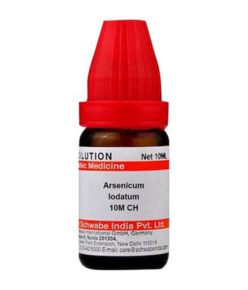 Dr Willmar Schwabe India Arsenicum Iodatum Dilution is used for treating lightheadedness and continuous irritating discharges that are watery and smelly with the membrane being inflamed with angry burns and itches. It is related to common viral infections, swelling of nose tissues, Eustachian tube enlargement, fatty degeneration, middle ear and nose degeneration, breast cancer, feeble heart, and lip epithelioma. It is also helpful in preventing cough discharge together with general and cardiac weakness. It provides effective treatment in case of severe pneumonia, diarrhea and helps in reliving restricted blood flow to heart muscles.